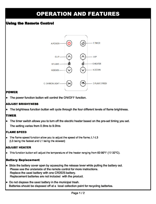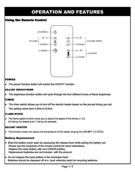 Replacement Remote Control for Festivo Electric Indoor Fireplace & TV Stand (For Fireplace Size 18" & 33")