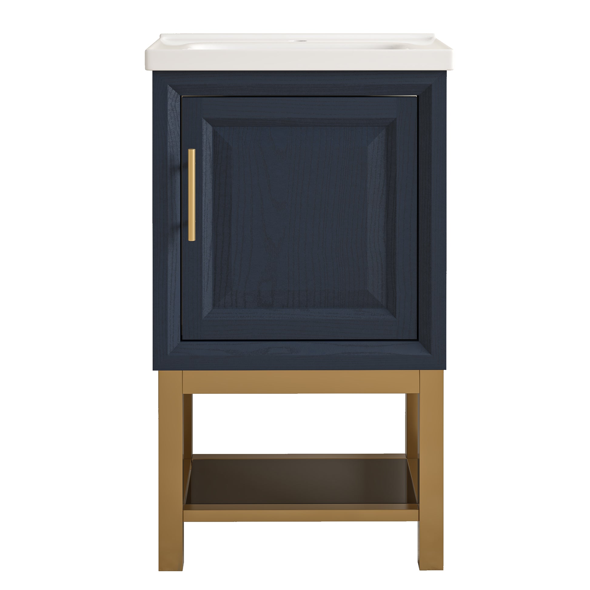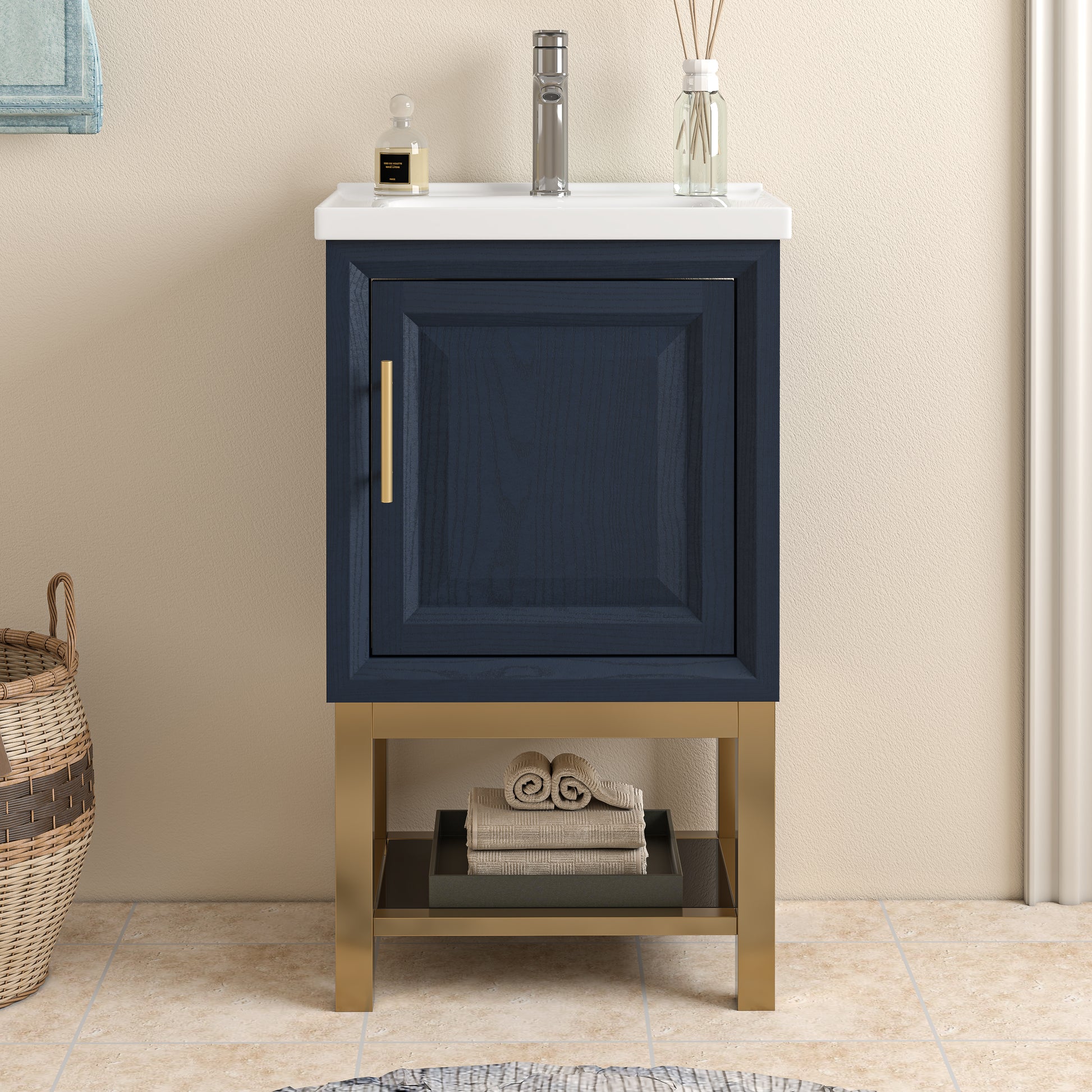Transform your bathroom with this sleek 20" freestanding single-sink vanity. The sophisticated design features a luxurious ceramic countertop and a sturdy GRC (Glass-Reinforced Concrete) storage cabinet for long-lasting durability. Stylish metal plate legs elevate the vanity's modern appeal, while the bottom glass shelf offers additional storage space for your bathroom essentials. This contemporary piece is perfect for compact spaces, combining functionality with a striking aesthetic that blends effortlessly with any décor. Add a touch of refinement and elegance to your bathroom today!