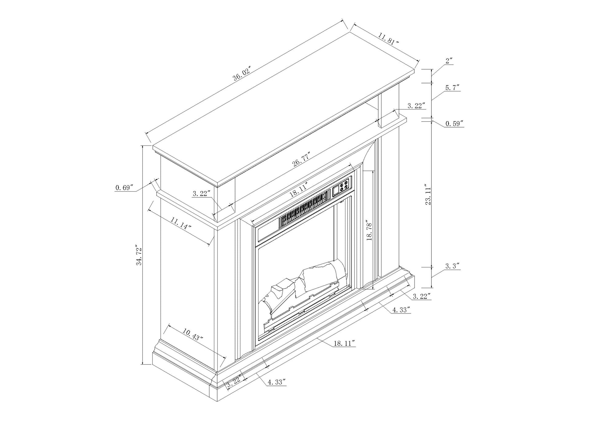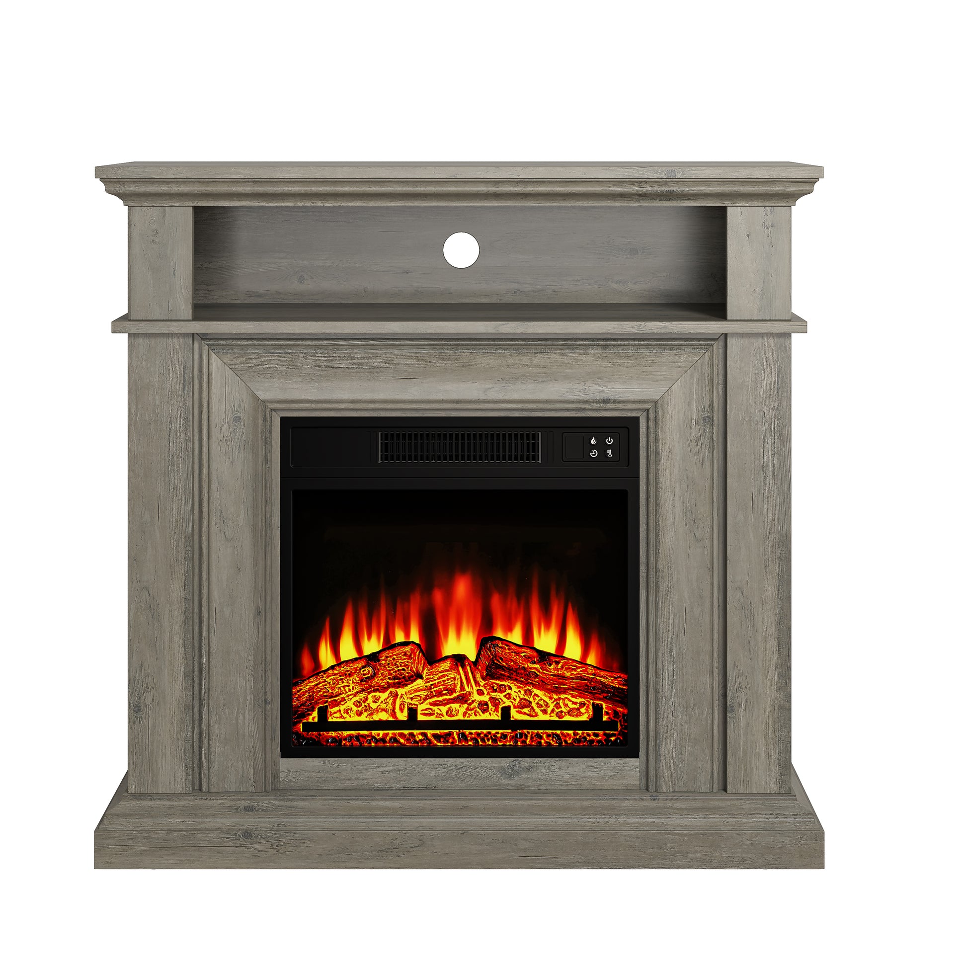 Create a cozy atmosphere in your living room, bedroom, or office with this 35"H x 36"W x 12"D electric fireplace. It plugs into any standard outlet, with no chimney required. The distressed wood mantel features classic molding and faux columns for a traditional look. This fireplace heats up to 400 sq. ft. with a 4700 BTU output, and the LED flame can be used with or without heat. Safety features include automatic shut-off and thermal overload protection. Includes a screen and artificial logs.