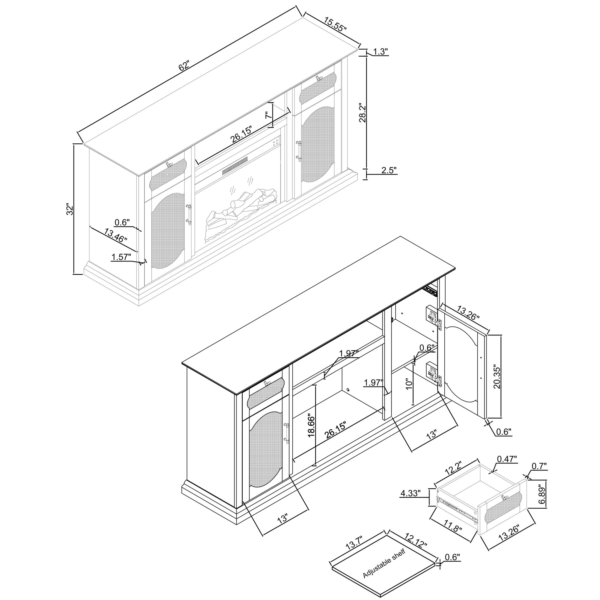 The wicker-touch doors and wood grain top surface add an elegant touch to the stand, while the spacious drawers offer plenty of storage for all your media and accessories. Additionally, the 26" fireplace serves as an excellent source of warmth, capable of heating up to 400 square feet, making your living room even more inviting and comfortable.