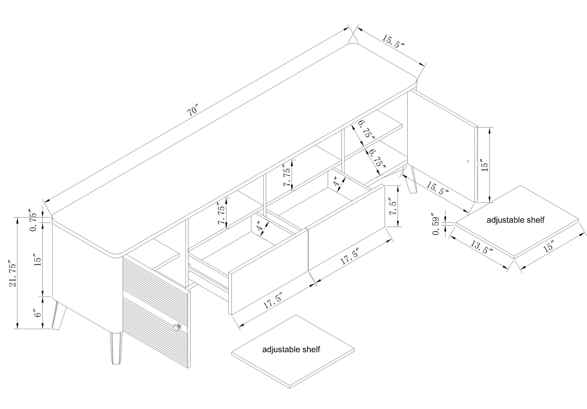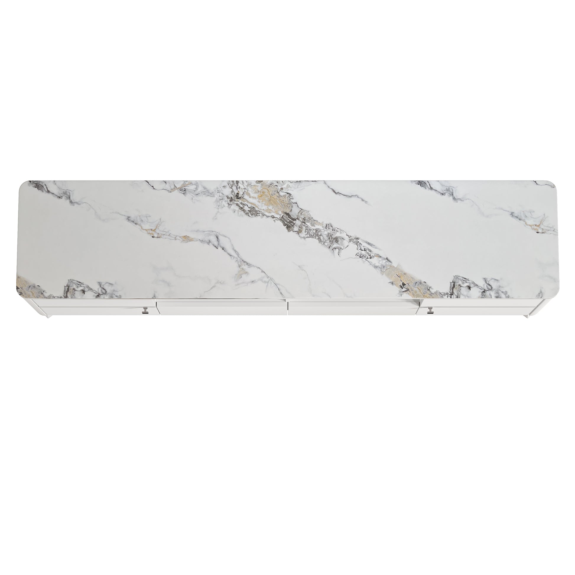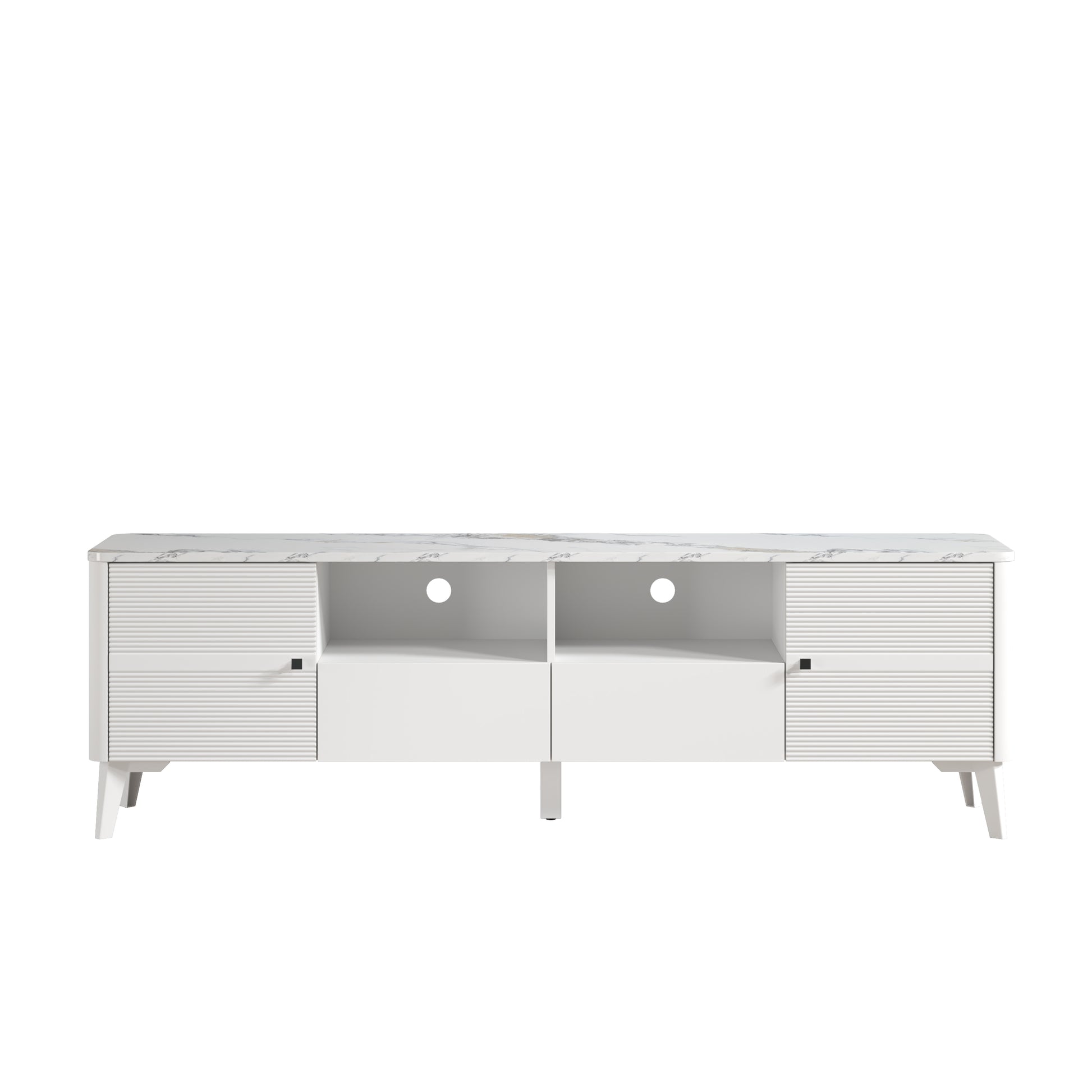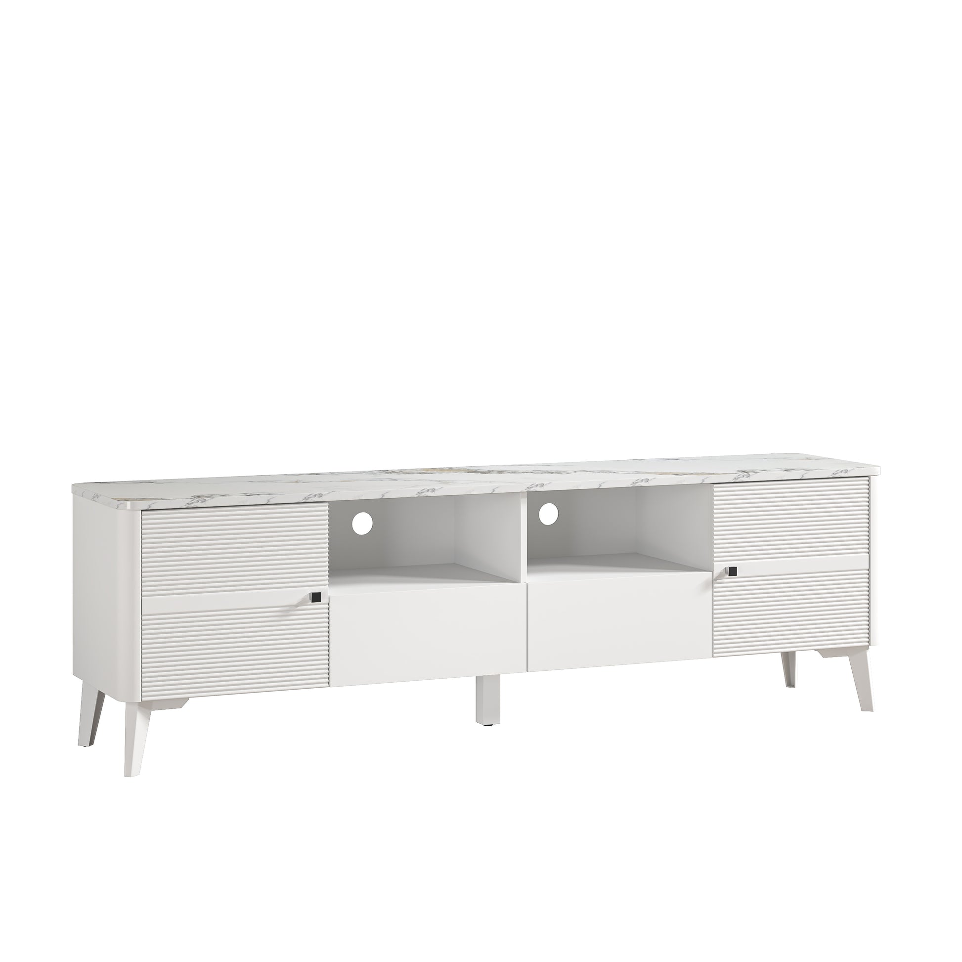 Elevate your entertainment space with our 70-inch TV stand, featuring a uniquely designed structure with two cabinets on each side and two drawers in the center, offering ample storage for your media essentials. The top panel boasts a sophisticated marble-printed finish, adding a touch of elegance to your living room.