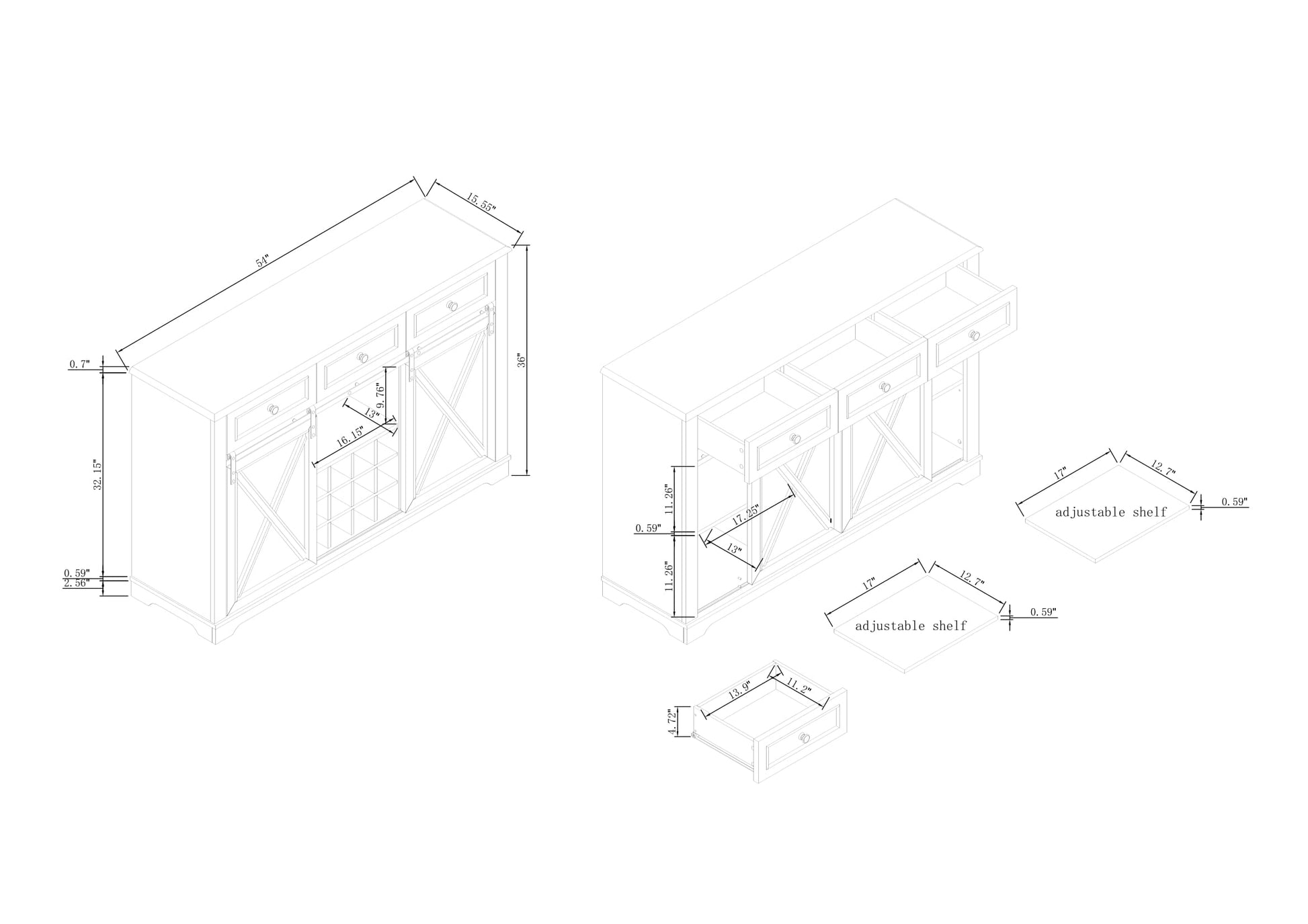 This 54" Farmhouse Style Wood Wine Cabinet combines rustic charm with modern functionality. Featuring 2 sliding doors, 3 spacious drawers, a 12-bottle wine rack, and 3 rows of slots for glasses, it's the perfect blend of storage and style. The wide top provides ample space for all your kitchenware, making it an ideal addition to any dining or entertainment space.