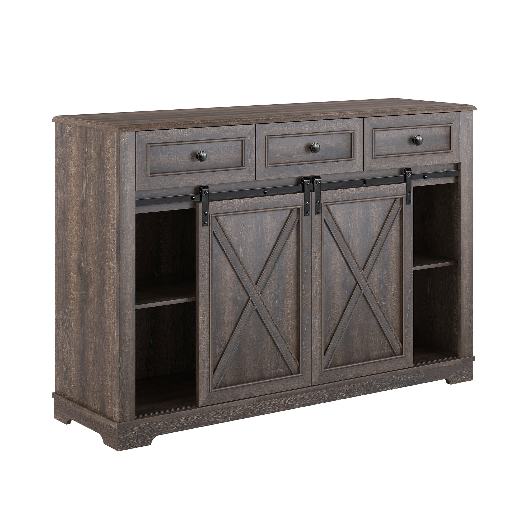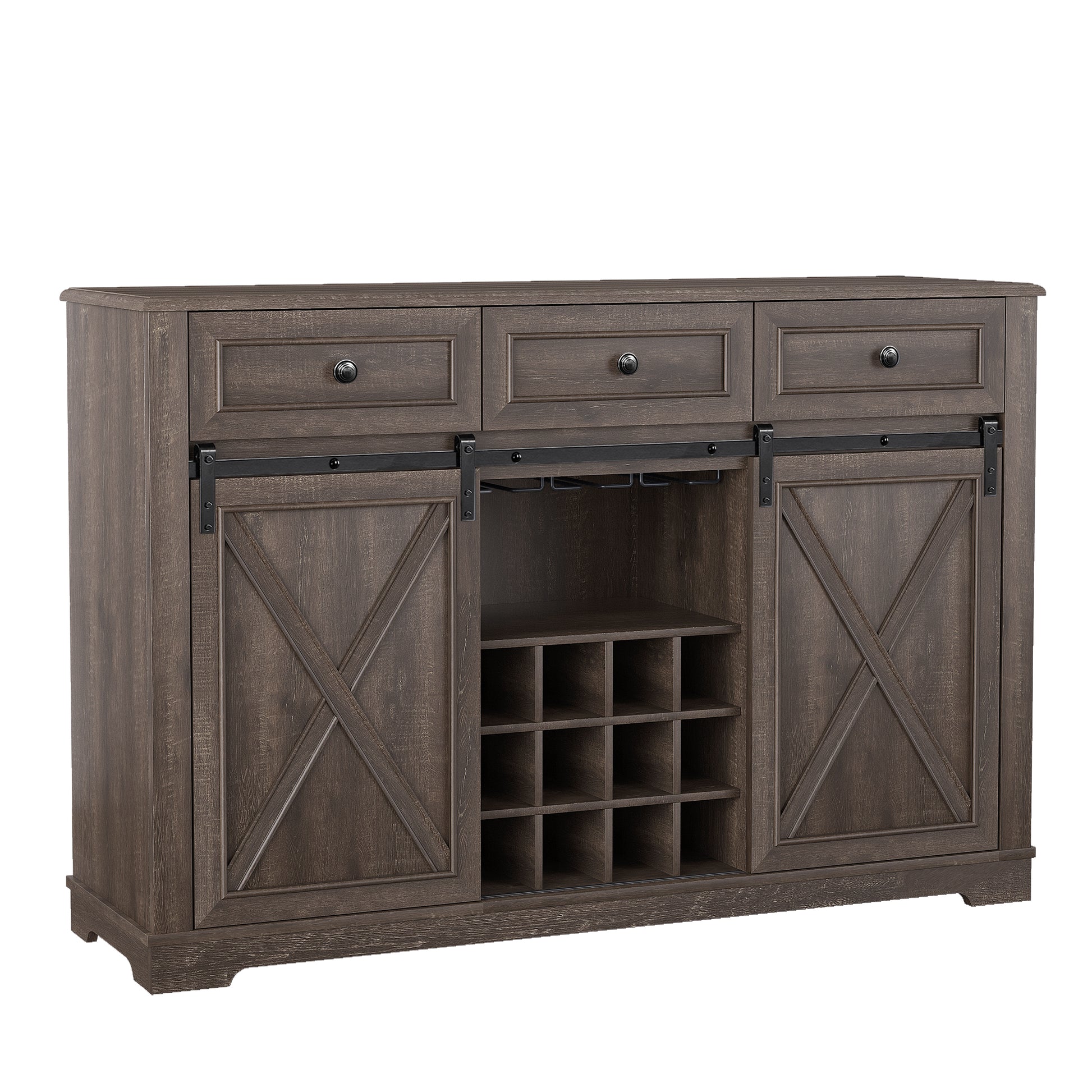 This 54" Farmhouse Style Wood Wine Cabinet combines rustic charm with modern functionality. Featuring 2 sliding doors, 3 spacious drawers, a 12-bottle wine rack, and 3 rows of slots for glasses, it's the perfect blend of storage and style. The wide top provides ample space for all your kitchenware, making it an ideal addition to any dining or entertainment space.